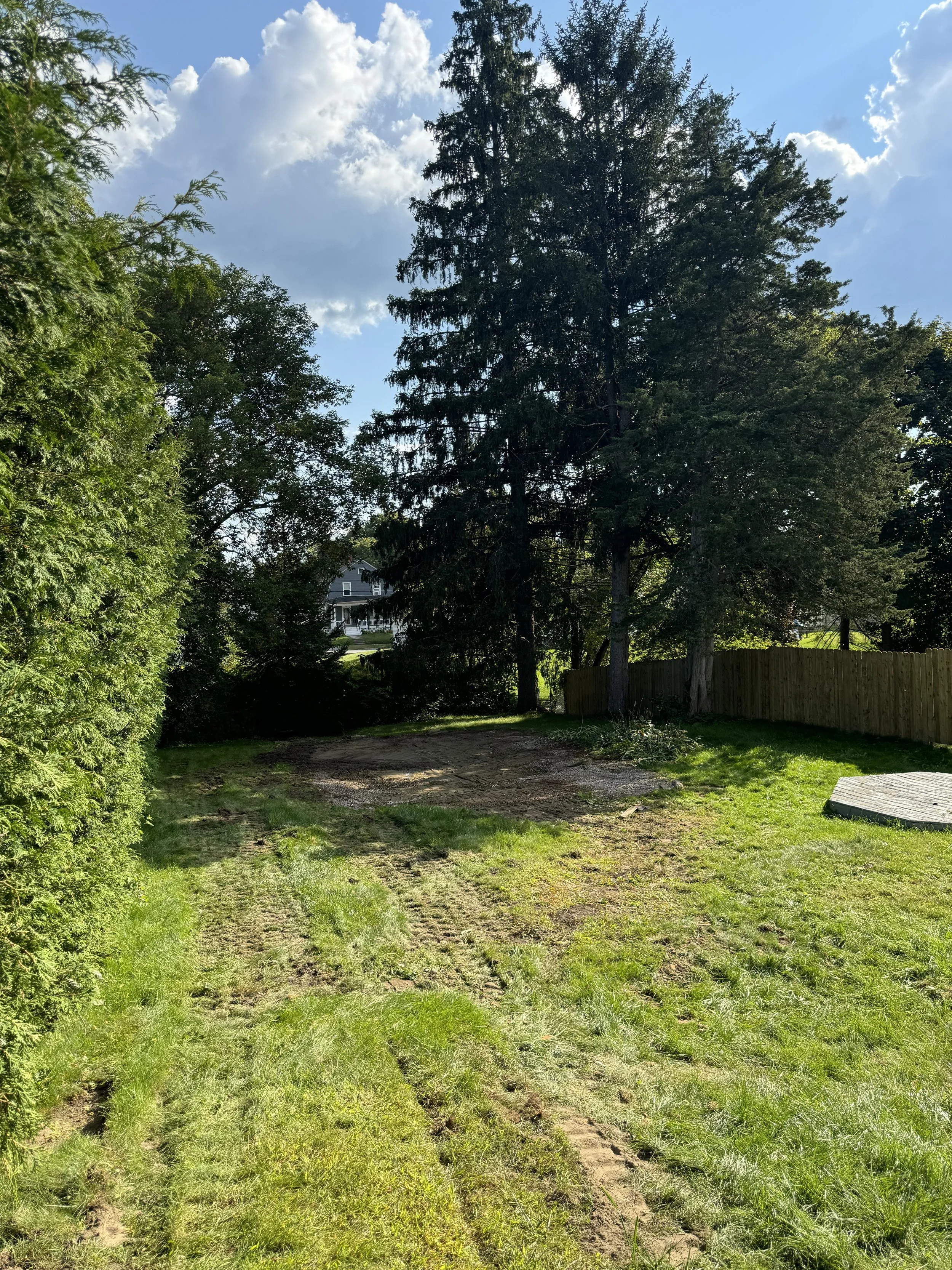A backyard with grass, trees, and a wooden fence. Dirt pathway and a house visible in the distance under a partly cloudy sky. Swimming pool and wooden platform have been demolished and the outdoor area restored.