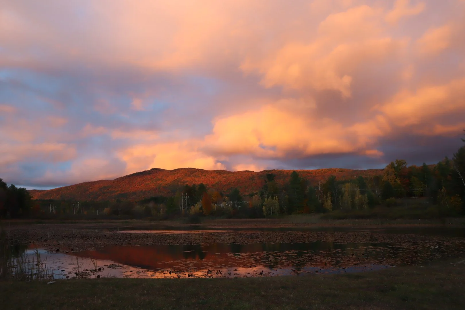 A land clearing site with a large pile of cut tree logs set against a backdrop of green trees and a partly cloudy sky, with a yellow excavator visible on the right. This is a midway point through the land clearing process.